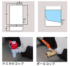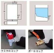 | コードNo. | 品番 | 容量 | コック形状 | コックネジ | A(内径) | B(幅) | C(高) | E(奥行) | H(全高) | 入数 | |