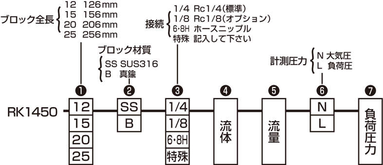 | 接続口 | 標準:RC1/4メネジ,オプション:φ6ホースニップル、φ8ホースニップル、1/8"スウェージロック、1/4"スウェージロック |