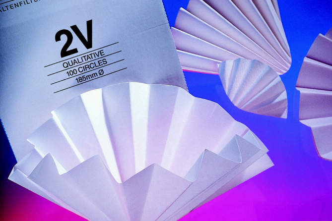- 三角ロートに合わせて濾紙を折る手間が省けます。4つ折りにした時に比べ有効濾過面积が大きくなるので濾過速度が早くなります。
